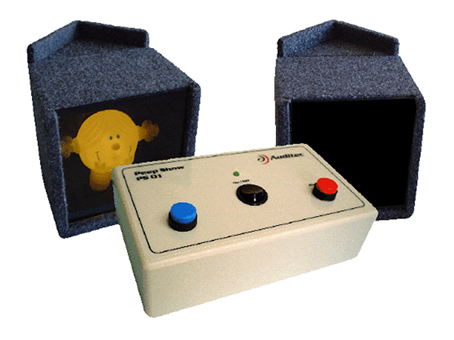 O Peep Show PS 01 foi desenvolvido para Audiometria Pedatrica, é composto por duas caixas de madeira, revestidas com carpete e possuem um frontal de vidro escuro, no interior das caixas ficam escondidos bonecos animados, que são iluminados através de um controle remoto com fio.